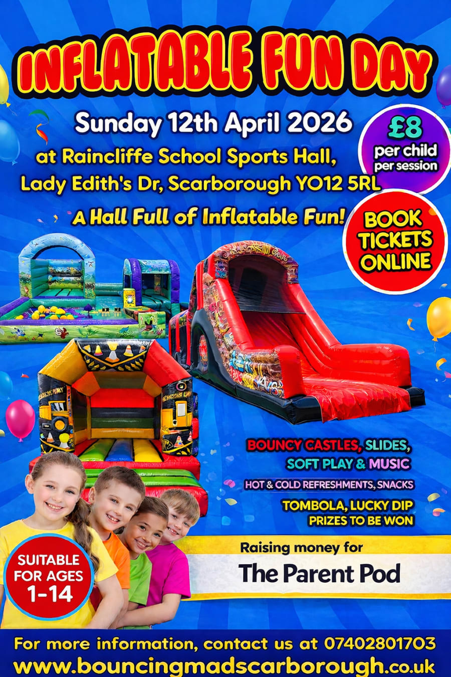 Get ready for an action-packed Inflatable Fun Day at Raincliffe School Sports Hall, where children can bounce, slide and play in a safe, fun-filled environment!