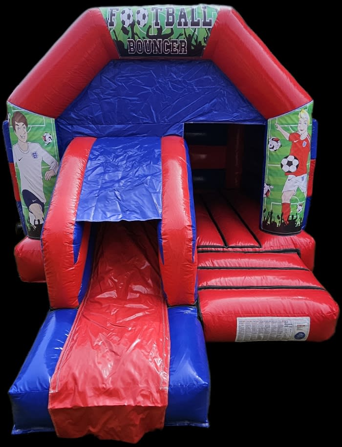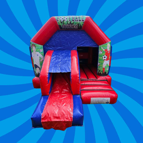 Kick off the fun with our Football Red and Blue Front Slide Combi Bouncy Castle—perfect for young footie fans ready to bounce, slide, and celebrate!