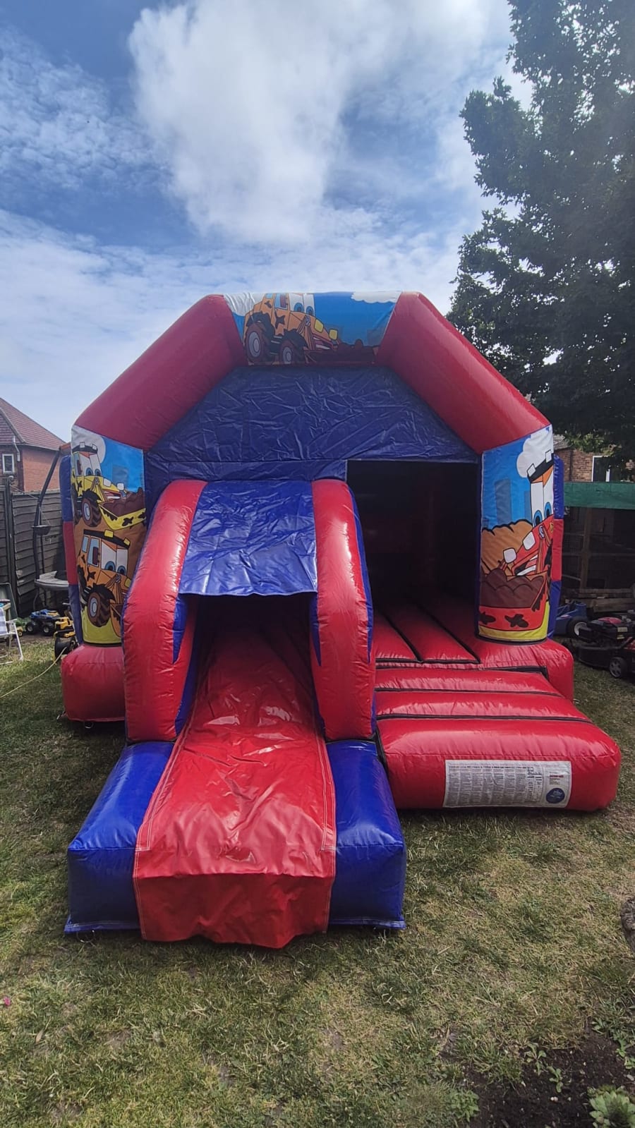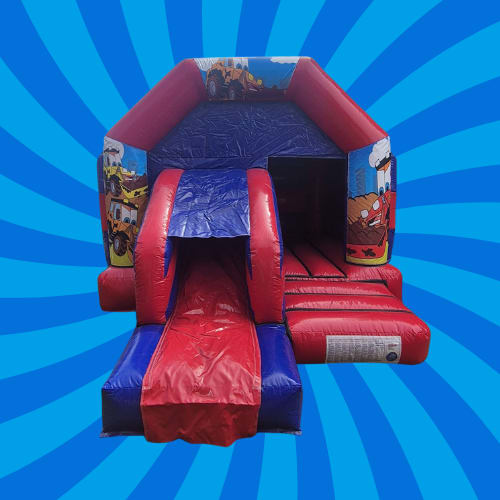 This Digger-themed inflatable features a bold red and blue colour scheme and a front-facing slide that adds extra excitement to any party or event.