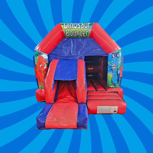 Step back in time and let the fun erupt with our Dinosaur Red and Blue Front Slide Combi Bouncy Castle—where prehistoric adventure meets modern party magic!