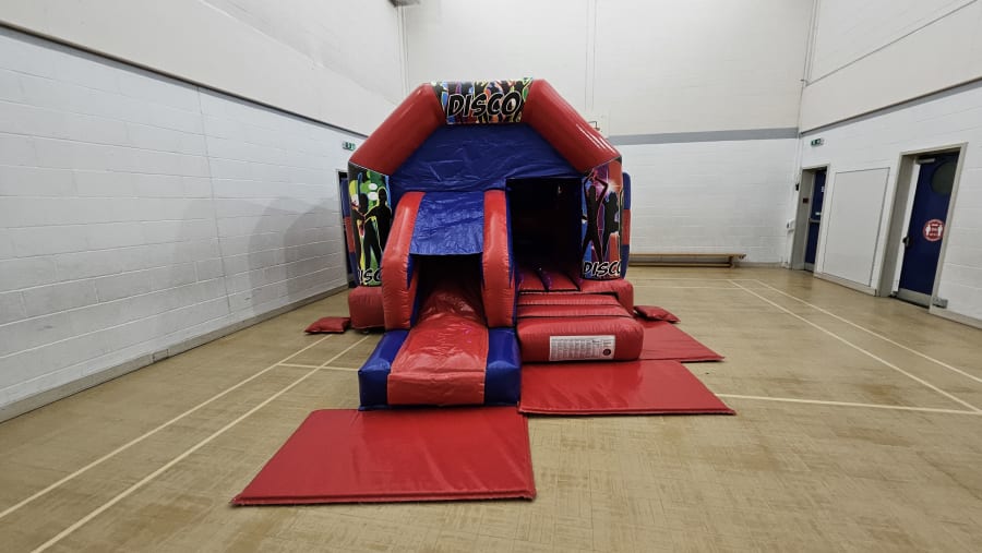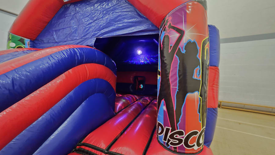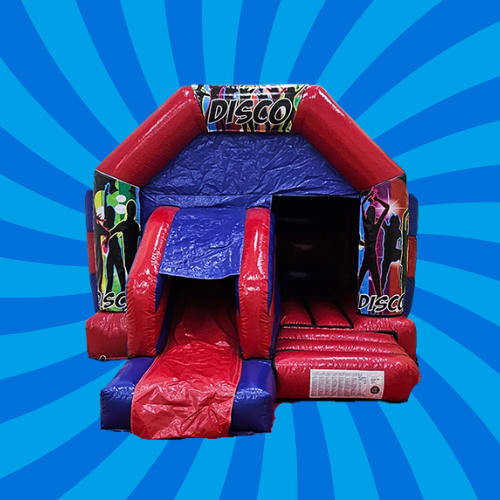 Turn up the volume and let the fun shine with our Disco Red and Blue Front Slide Combi Bouncy Castle—where bouncing meets boogie!