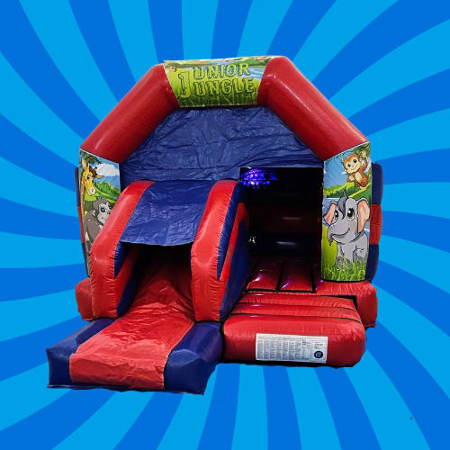 Swing into adventure with our Jungle Junior Red and Blue Front Slide Combi Bouncy Castle—perfect for pint-sized party animals!