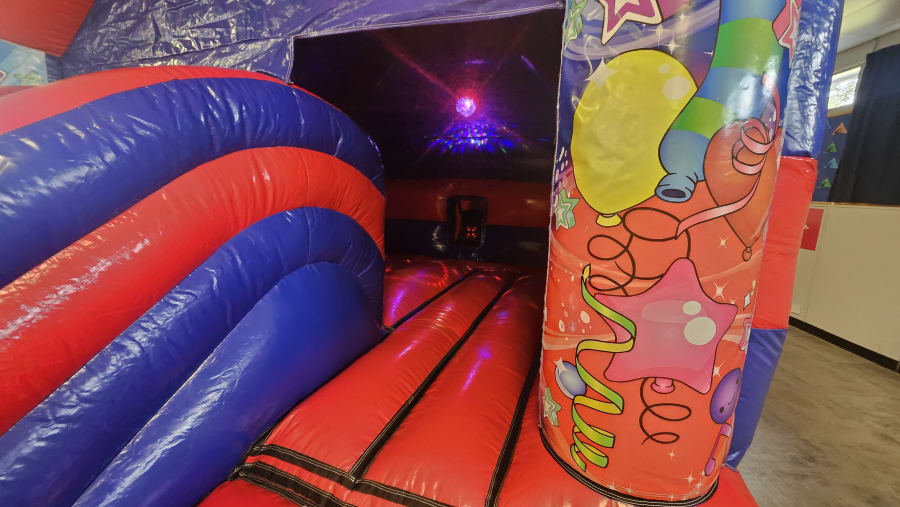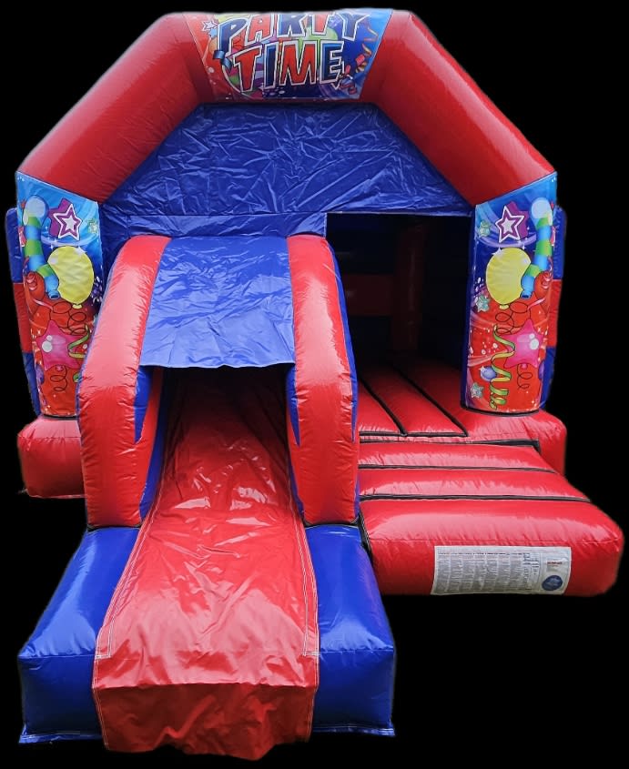 Celebrate in style with our Party time Red and Blue Front Slide Combi Bouncy Castle—where every bounce brings a smile!